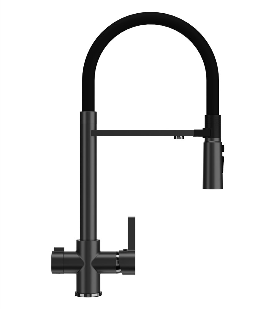 Смеситель ULGRAN U-026 – это стильный современный кухонный смеситель с высоким гибким изливом черного цвета. Материал корпуса выполнен из высококачественной латуни, сверху корпус смесителя покрыт хромом.
